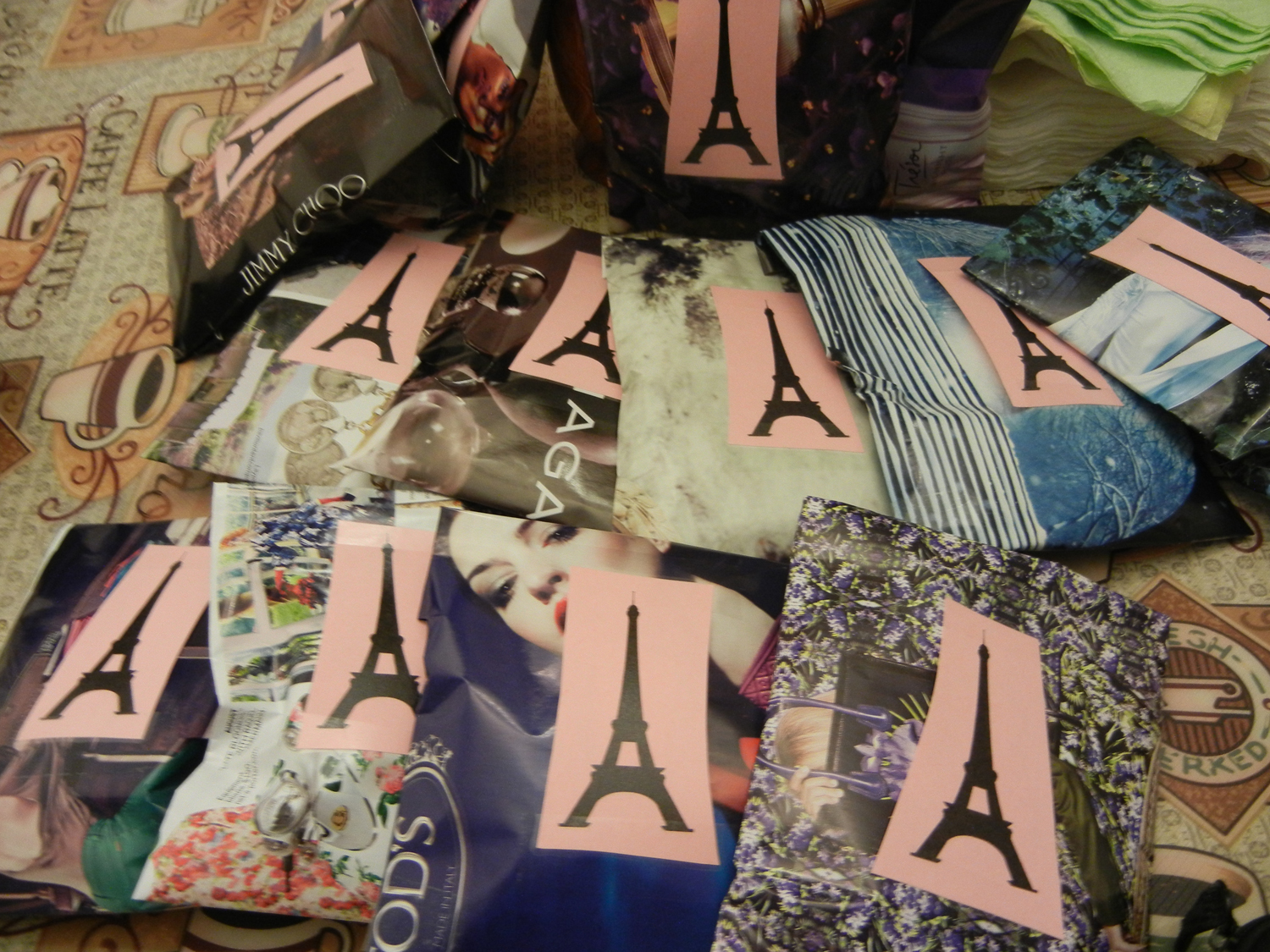 Eiffel Tower favor bags, also made of recycled Vogue Magazine pages