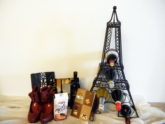 some of our gifts- Paris frame, Milano cookies, shoes, gift cards, an eiffel tower wine rack, and of course, lots of tasty wine.