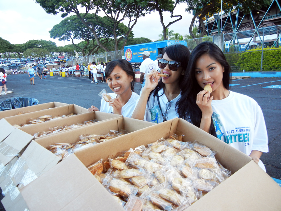 Sponsored by Kaiser Permanente, the Great Aloha Run is an 8.15 mile course that begins at Aloha Tower and ends at the Aloha Stadium. This year had the largest number of participants. I was not physically prepared to run or walk 8+ miles, but assisting with refreshments for the runners was definitely a yes. At 4 in the morning I woke up groggy-eyed, but totally ready to pass out bananas and macadamia cookies to the finishers of the race. Yes, macadamia nut cookies…