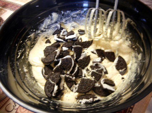 4.) Take 1/2 of the remaining cookies, break into pieces and add to cake mix.