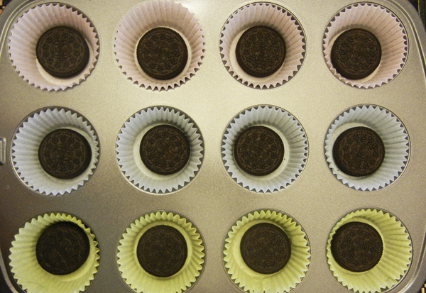 3.) Line cupcake tins with liner, place one regular size Oreo cookie in each liner.