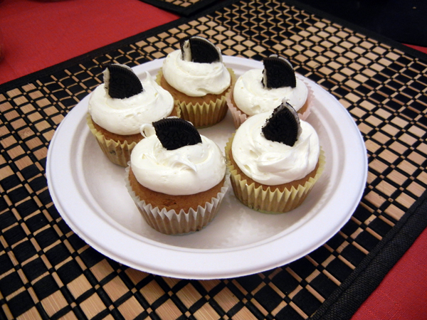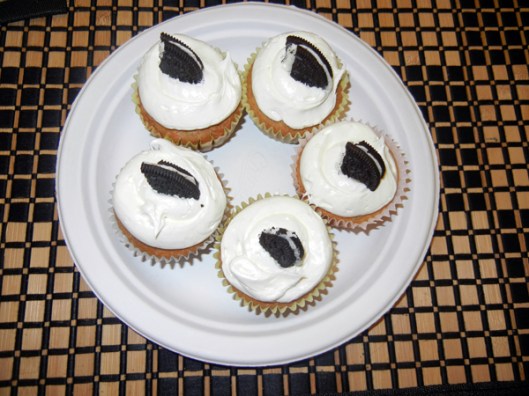 7.) Cool cupcakes and decorate using remaining regular sized Oreos (cut 1/4) or mini Oreos.