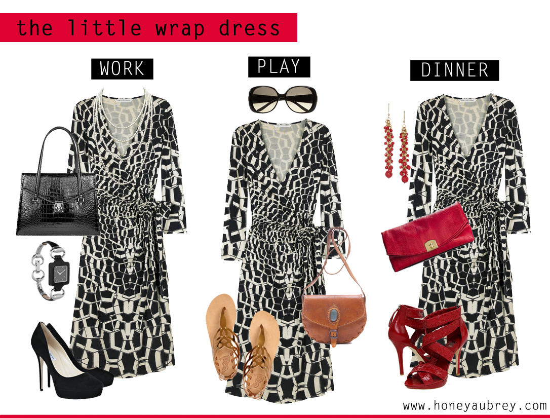 You can use the wrap dress for work and play, depending on shoes and accessories included in the ensemble. Pair it with a pair of stunning red heels, chandelier earrings and a clutch, and wala!- you’re ready for date night with Prince Charming. Dress it down with gladiator sandals, a crossbody bag, floppy hat and oversized sunglasses, and you are set for a cruise in the Mediterranean.